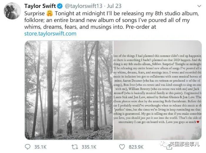 7月23日,“霉霉”Taylor Swift突然在推特上宣布了壹個大驚喜,24日零點她要發新專輯了!
