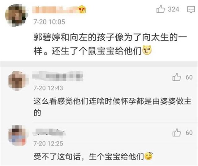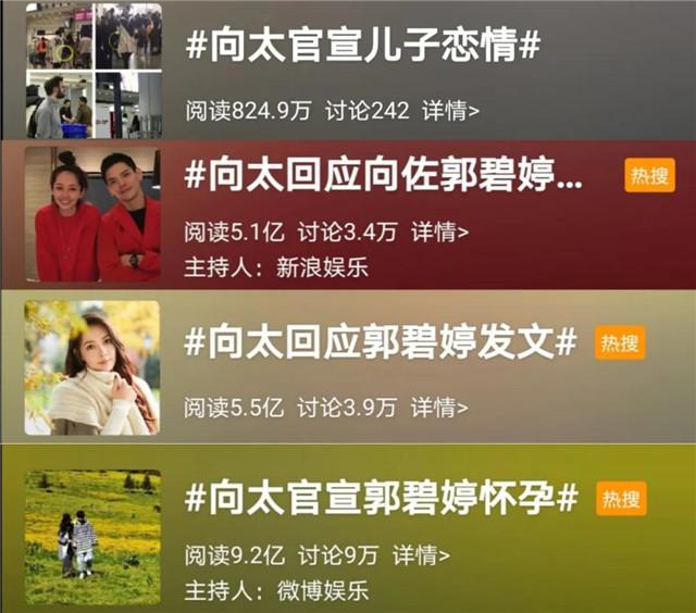 就例如前壹段時間,郭碧婷和向佐懷孕的事情鬧得沸沸騰騰,但是這壹件事情並不是由向佐和郭碧婷公布出來的,而是通過向太在微博上面宣布的,讓人感到非常的詫異,但是這壹件事情好像又是情理之中,畢竟壹直以來,向太都是以壹個向佐和郭碧婷的官方發言人的形象出現在大家眼中的。