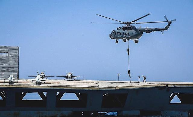 根據報道看,當時伊朗方面出動了掛載“努爾”(山寨的C-802)反艦導彈的直升機對這艘“航母”進行了攻擊,成功擊中了這個不會運動的活靶,隨後,伊朗革命衛隊的武裝快艇跟波斯海盜壹樣,圍繞著“航母”不斷轉圈,這也是革命衛隊騷擾海峽中美國軍艦的慣常做法,只是不清楚武裝快艇上的革命衛隊隊員是否進行了跳幫奪船;此外,還出動直升機在航母甲板上索降了多名特種兵,更是有特種兵直接傘降到航母甲板上,對航母和艦載機進行了破壞演練,模擬俘獲這艘美國“航母”。