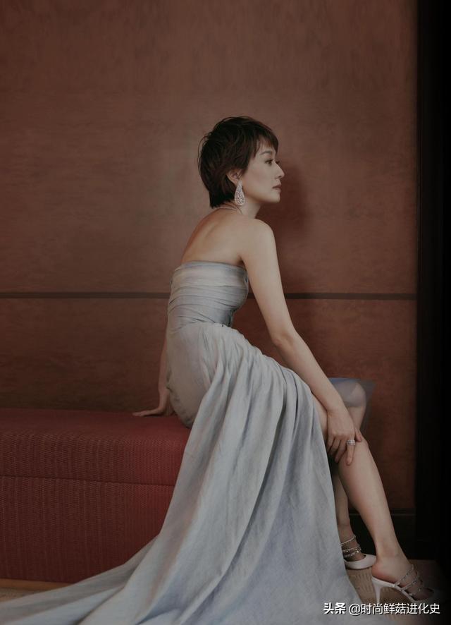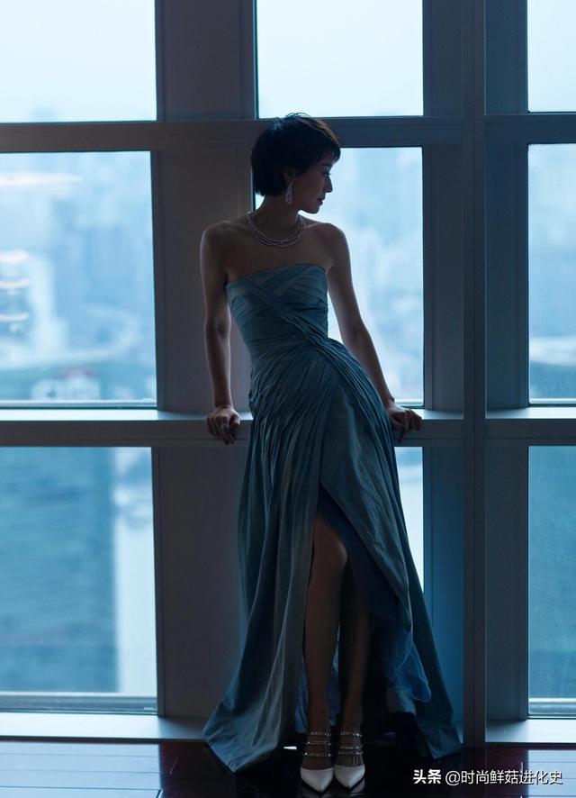 抹胸的露肩設計是整款禮服裙的設計重點,將馬伊琍的肩部曲線充分彰顯,同時為了避免純色的禮服款式顯得有些過於單調,整件露肩禮服裙在衣身上設計有褶皺的細節設計,不僅有效打破了純色禮服款式的乏味,同時也巧妙加強了禮服裙的款式層次,讓禮服裙看著更加富有設計感,造型優雅又獨特。
