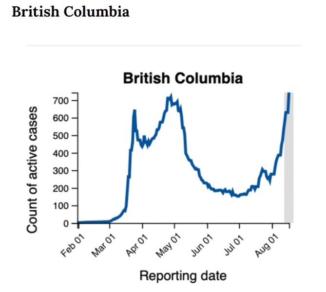 事實上,BC省到目前為止,該省記錄了單日100例的最大新增日,並在8月14日至8月17日之間記錄了236起新病例。