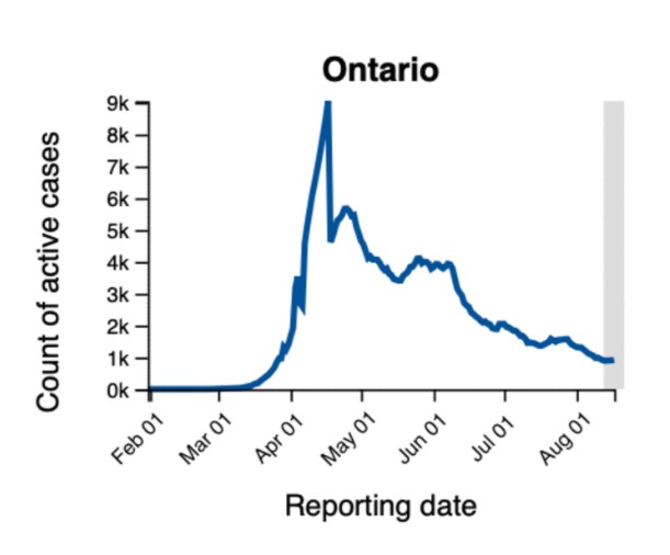 盡管有積極跡象表明安省趨於平緩,但該省在8月18日出現了峰值,今天壹天報告了125例新病例。