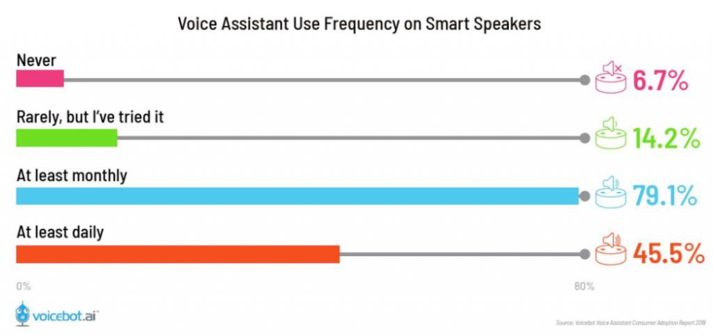 研究機構 Voicebot.ai 在 2018 年發布的研究中提到,有 79.1% 的用戶有每個月使用智能音箱的習慣,其中又包括占整體 45.5% 的用戶已經在 日常使用 。 [ 3 ] 連李彥宏也在 2019 年公開承認: 以智能音箱為代表的智能家居,可以說是 AI 時代搜索的新入口。