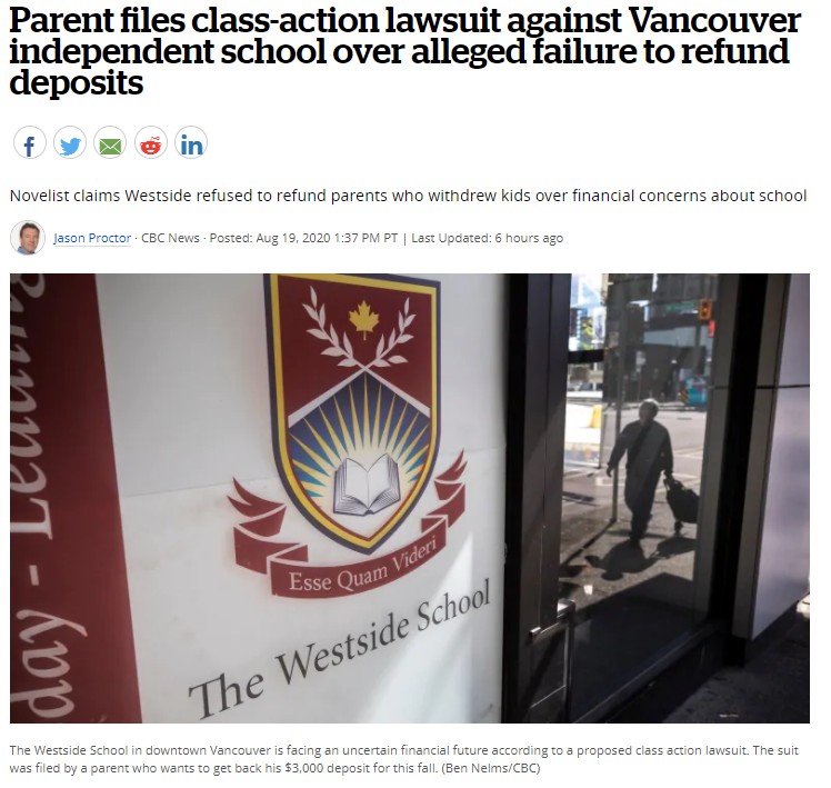 (加西網綜合)據CBC News報道,溫哥華市中心壹間私校沒有退還數千元的入學注冊押金給學生家長,面臨集體訴訟。