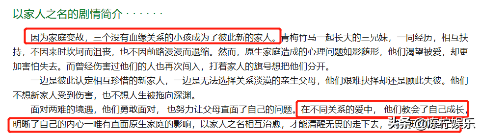 《以家人之名》最開始的故事簡介裡,只告訴觀眾,該劇聚焦的是當下討論度很高的原生家庭問題(字裡行間可是壹點愛情元素都不沾),題材高端又接地氣;