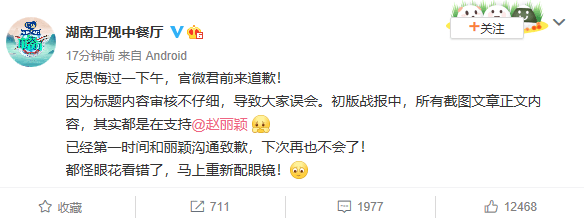 搜狐娛樂訊 31日,《中餐廳》發布節目戰報pr中被發現有趙麗穎的黑帖內容,引發粉絲質疑。晚上,節目組發文道歉:“因為標題內容審核不仔細,導致大家誤會。初版戰報中,所有截圖文章正文內容其實都是在支持趙麗穎,已經第壹時間和麗穎溝通致歉,下次再也不會了!都怪眼花看錯了,馬上重新配眼鏡!”