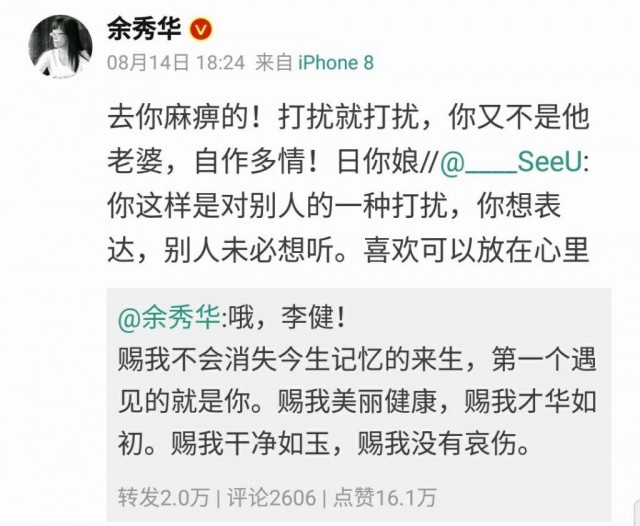 有網友認為她這樣表達拾分不妥,於是出言幹涉,讓她不要打擾李健。於是她開罵了: