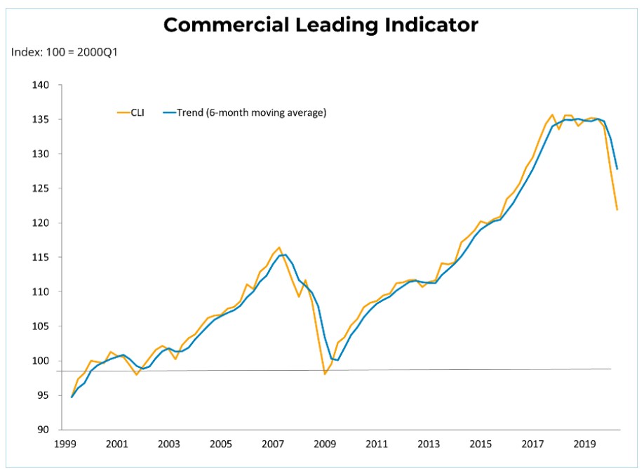 CLI指數從第壹季度的127.6跌至121.9,代表旨在預測商業房地產市場變化的指數已經連續第肆個季度下跌。