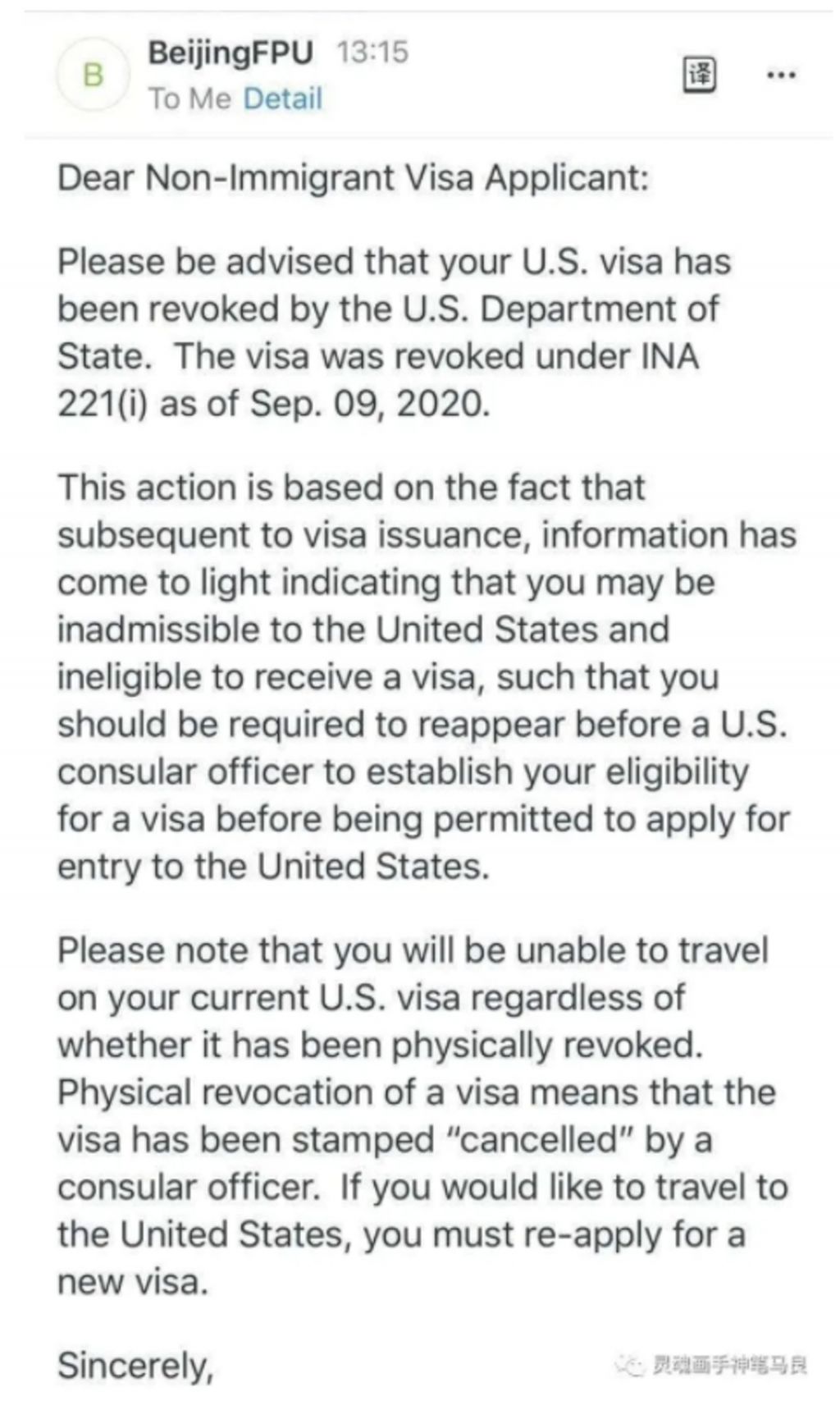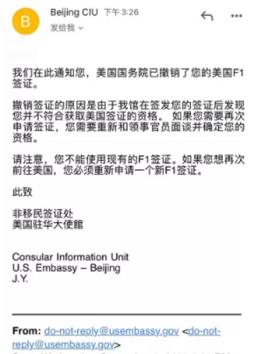 9月9日中午開始,很多中國學生陸陸續續接到寄件者郵箱地址為BeijingFPU@state.gov的郵件,通知其F1學生簽證/B類旅游簽證已經被美國國務院取消,理由是大使館在審核後發現簽證持有人不符合獲取美國簽證的資格。如果簽證持有人需要再次入鏡美國,需要重新申請新的簽證,並重新預約面簽。