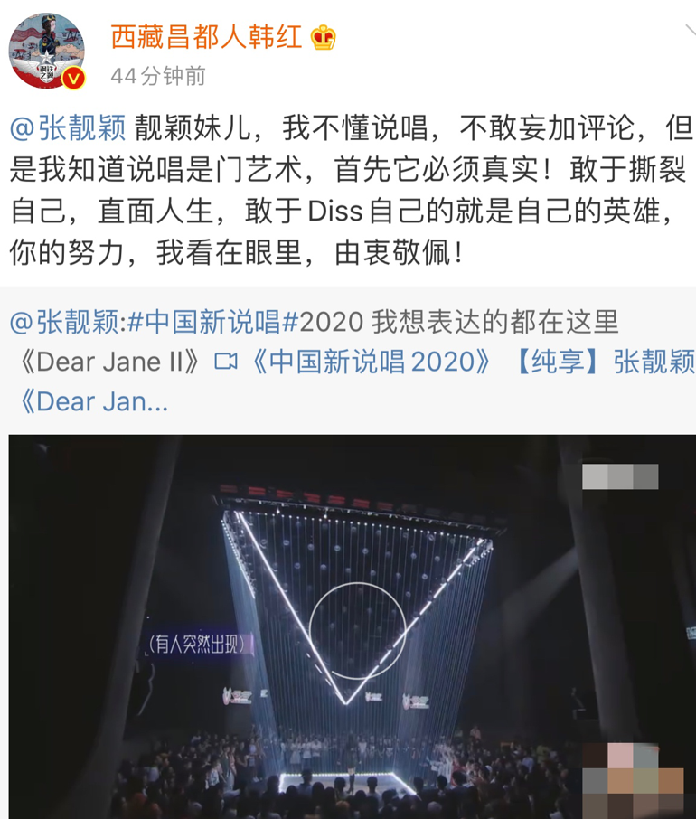 張靚穎在今晚發布自己唱歌的現場視頻後,獲得了韓紅的大力支持。韓紅說稱自己不懂說唱,就不敢妄加評論。但是她認為張靚穎敢於直面人生,甚至diss自己,大贊說:"你的努力,我看在眼裡,由衷敬佩!"