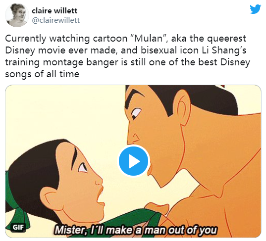 李翔並未在木蘭變回女兒身之後愛上木蘭,反而在仍是男裝花平的時候,就被ta深深吸引。每次看到“我要把你變成男人(I‘ll make a man out of u)”,Mathew都興奮不已。