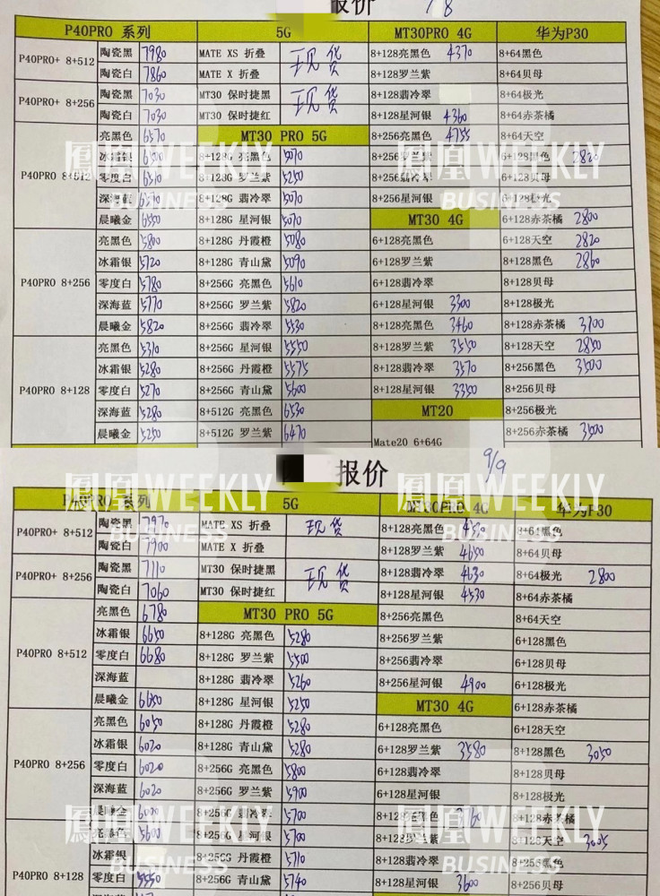 華強北某批發市場的兩份報價單顯示,8月18日至9月9日,華為部分機型上漲200元左右。