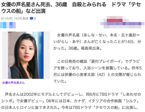 9月14日,據日媒報道,36歲日本女星蘆名星被發現在家中去世,死亡原因疑似是自殺,蘆名星曾和叁浦春馬拍攝同壹部劇,兩人先後去世令人驚訝。