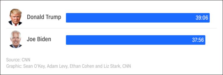 在將近兩個小時的電視辯論中,除去主持人華萊士開場介紹、提問和控場的時間,特朗普共計發言 39 分 6 秒,拜登則用時 37 分 56 秒。