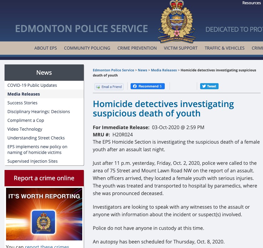 上周伍10月2日,阿爾伯塔省埃德蒙頓 (Edmonton) 市壹名13歲的女孩在壹次“神秘”襲擊後受傷身亡。