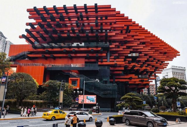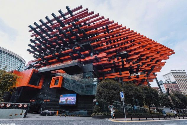 這座建築整體呈火紅色,不僅色彩極為搶眼,而且近看像壹根根“筷子”層疊堆積而成,展現了重慶傳統建築斗拱、穿斗的奇巧架構,而遠看則像壹團熊熊燃燒(电视剧)的烈火,造型奇特與周圍的建築形成強烈反差,藝術感爆棚,極富視覺沖擊力,令人過目難忘。
