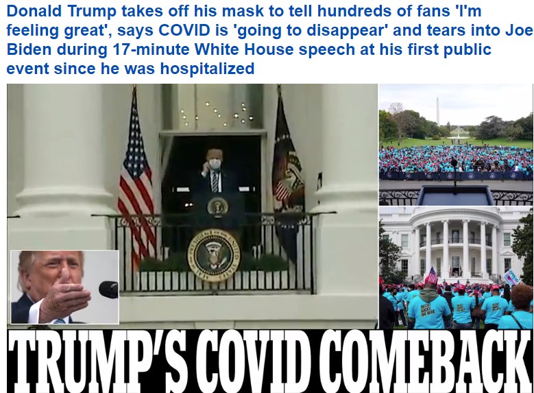 不過,人家川普剛的很,自從診斷成為白宮“超級傳播者”以來,川普今天10月10日就舉行出院後第壹次公開活動,脫口罩對支持者發表講話,宣布自己身上的新冠病毒“消失”了。