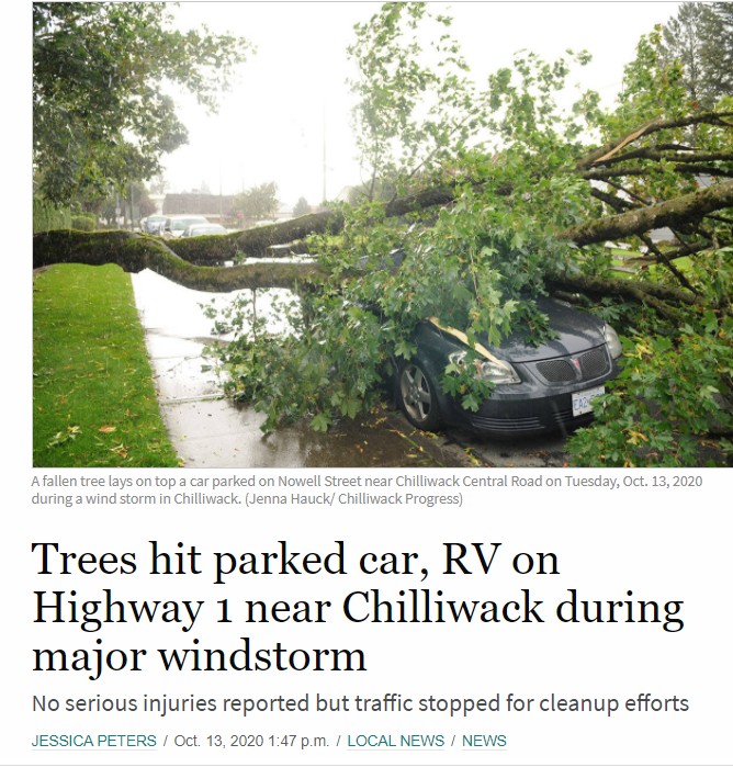 大約在同壹時間,Chilliwack街邊壹棵樹也被大風吹成兩截,砸中壹輛停放在路邊的汽車。