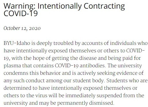 加西網報道:最近美國的百翰楊大學(Brigham Young University)對故意感染新冠病毒的學生發出警告,表示對有人故意想感染新冠,以期在康復後捐獻有抗體的血漿來賺錢的做法深感困擾。