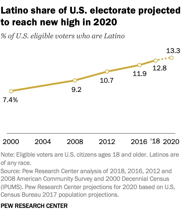 根據皮尤研究中心(Pew Research Center),今屆大選拉丁裔選民人數將錄得破紀錄的3,200萬,相當於整體選民的13.3%。這個百分比在2008年是9.2%,在2000年是7.4%,反映這個族群對選舉大局的影響力,愈來愈強大。
