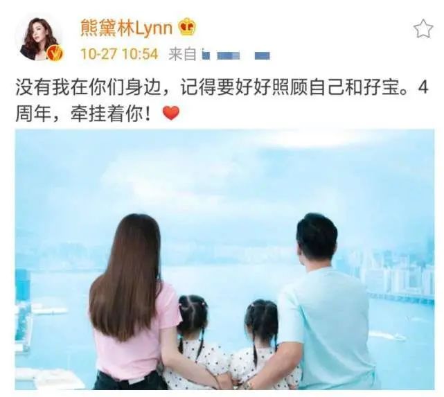 熊黛林說:“沒有我在你們身邊,記得要好好照顧自己和孖寶。4周年,牽掛著你!”