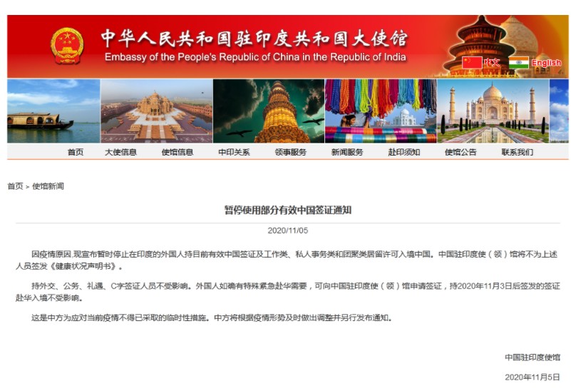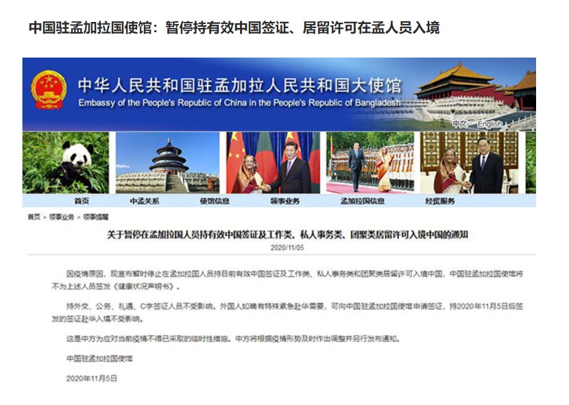 11月5日,中國駐英國,菲律賓,孟加拉,印度大使館網站陸續發布《暫停使用部分有效中國簽證通知》。