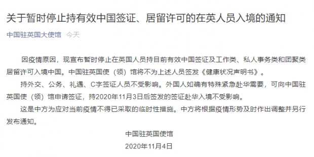 繼本月初中國入境政策再收緊,提出入境中國需"雙陰性"病毒檢測報告新規後,11月4日,中國駐英使館發公告稱因疫情原因,暫停在英國人員持目前有效中國簽證及工作類、私人事務類和團聚類居留許可入境中國,並指這是中方為應當前疫情不得采取的臨時措施。