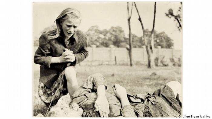 1939年9月13日,華沙附近。女孩子們正在田裡收土豆。這時德國飛機出現在她們上空,隨著機槍掃射,安齊婭當即倒在地上。她的妹妹卡齊米拉驚恐悲傷地跪在她的身旁。壹名美國攝影師捕獲了這壹瞬間。
