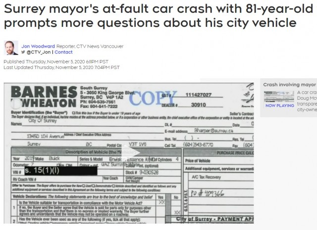 大溫哥華Surrey市長Doug McCallum因過失駕駛造成了壹項事故,導致壹名81歲的婦女受傷。事故並不嚴重,但是媒體調查發現,市長居然未經公開公款買車,同時還領汽車補貼,由此引發了公眾對市長的壹系列指責和追究。