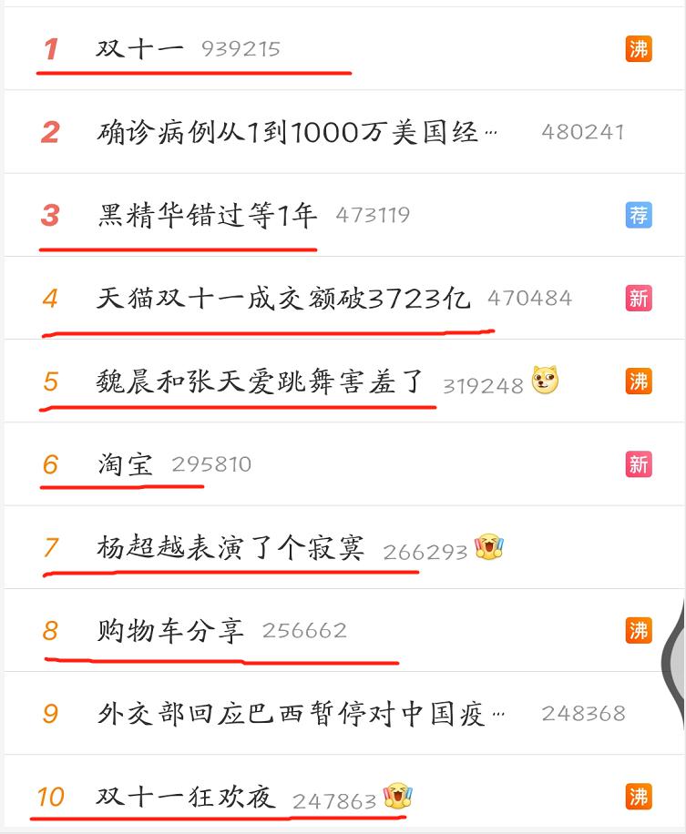 與雙 11 相關的內容也幾乎霸占了微博熱搜榜單。11 日零時起,諸多維度的雙 11 銷售數據也陸續公布,用戶在看偶像與買買買之間無縫銜接,各家平台也都沉浸在 沖破紀錄、再創新高 式的狂歡中。