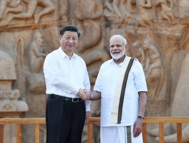 印度總理莫迪(右)今天透過視訊在"上海合作組織"峰會致詞時強調,為進壹步深化組織成員國間的連結,必須尊重彼此的主權和領土完整。圖為中國國家主席習近平(左)2019年10月造訪印度合影。(法新社)
