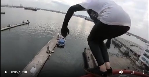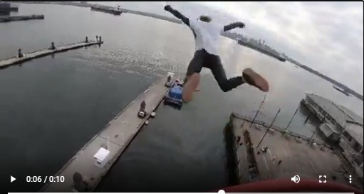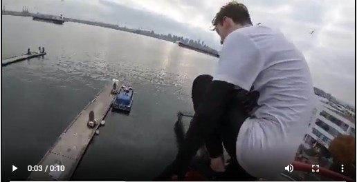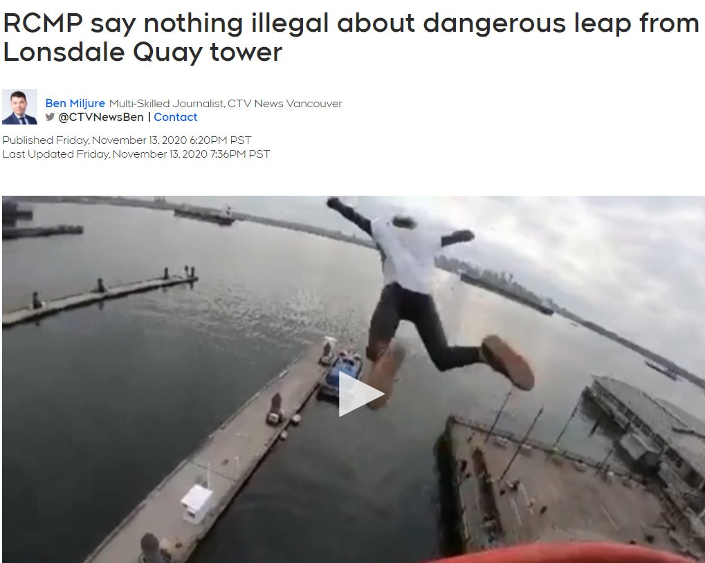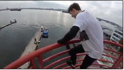 在Reddit用戶Nikzral發布的壹段視頻中,顯示壹枚小帥哥出現在北溫Lonsdale Quay觀景塔上,他還爬上了平台欄杆,在拍攝視頻者倒數後跳了出去,在空中飛速下墜後,壹頭扎進水中,驚起了沖天水花。