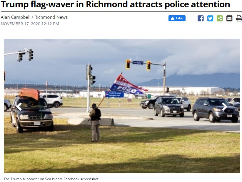 REF:https://www.richmond-news.com/news/trump-flag-waver-in-richmond-attracts-police-attention-1.24240782- 溫哥華網版權所有,未經授權或許可,嚴禁轉載或摘錄