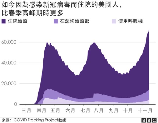 令人振奮的是,使用呼吸機的病人數與此前的高峰水平相比有所減少,這說明自春季以來,針對新冠的治療有所進步。