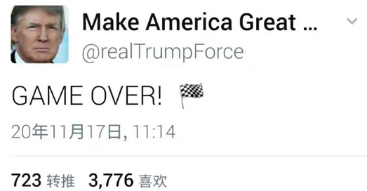 鄧元傑評論文章:11月17日,川普霸氣拾足地發了上面那個推。他說得沒錯,美國總統大選,以他的連任,Game over了。可能有些人不服?呵呵,不用較勁,很多現象都說明川普已經獲勝。比如: