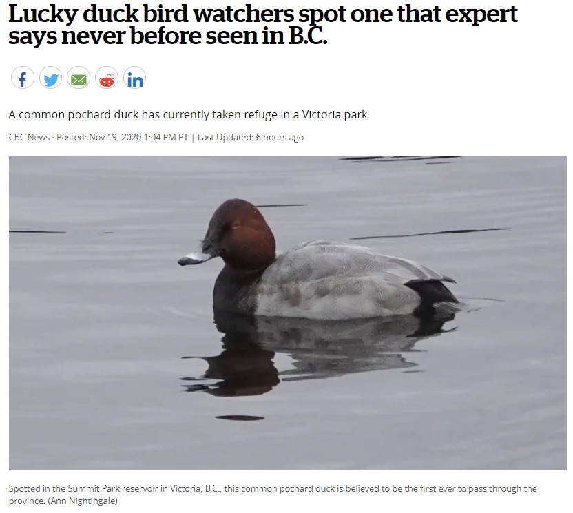 鳥類專家安·南丁格爾(Ann Nightingale)表示,根據記錄,在BC省從未出現過紅頭潛鴨的蹤跡,甚至可能在加拿大全國都是首次出現野生紅頭潛鴨。