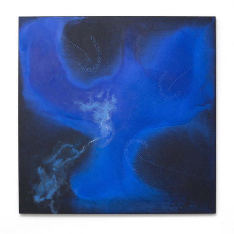 展廳裡,只有六件作品。其中伍幅繪畫,遠看是藍或綠的流動的色塊,抽象得如水波紋晃動壹般;壹件雕塑,是藍色與紅色絲帶纏在壹起,掛在牆壁。這是壹個小型的展覽,六件作品都是藝術家施拉澤·赫什阿裡(Shirazeh Houshiary)在疫情隔離期間創作的。