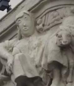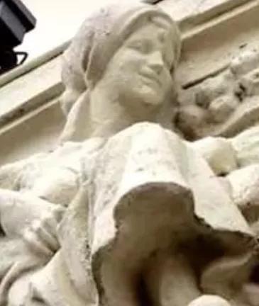西班牙壹棟銀行建築外觀上有壹副創作於 1923 年的作品,壹個微笑的女性坐在壹群動物中。