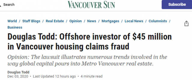 據報道,壹位名叫張同(Tong Zhang,音譯)的華裔地產投資商向法院提起控訴,稱他先後將$4,500萬加元委托給另壹名華人尹航(Hang Yin,音譯)在溫哥華投資房產,沒想到遭到了欺騙和欺詐。