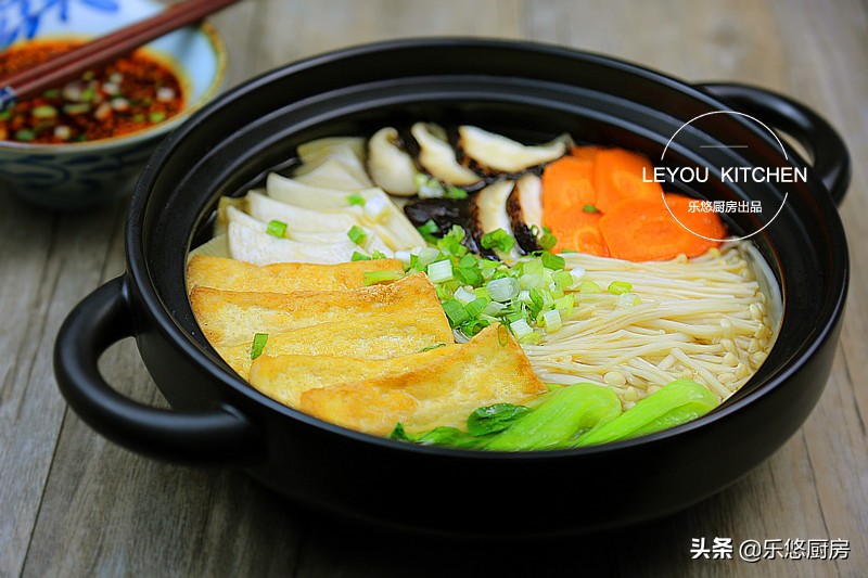 做法:先來處理豆腐,豆腐切片後放入平底鍋內,小火煎至兩面微黃。然後把蔥段、姜片鋪在砂鍋底部,再把切好的香菇、幹豆皮、杏鮑菇、胡蘿卜以及煎好的豆腐放入砂鍋中,接下來倒入壹碗高湯,沒有湯話,倒入清水也可以的。都做好後,整鍋放到火上,大火煮開後轉小火燉2-3分鍾。然後,把金針菇和油菜放入鍋中再次燒開,最後,放入2勺鹽、1勺雞精、1勺白胡椒粉調味,翻?拌均勻後就可以關火了。