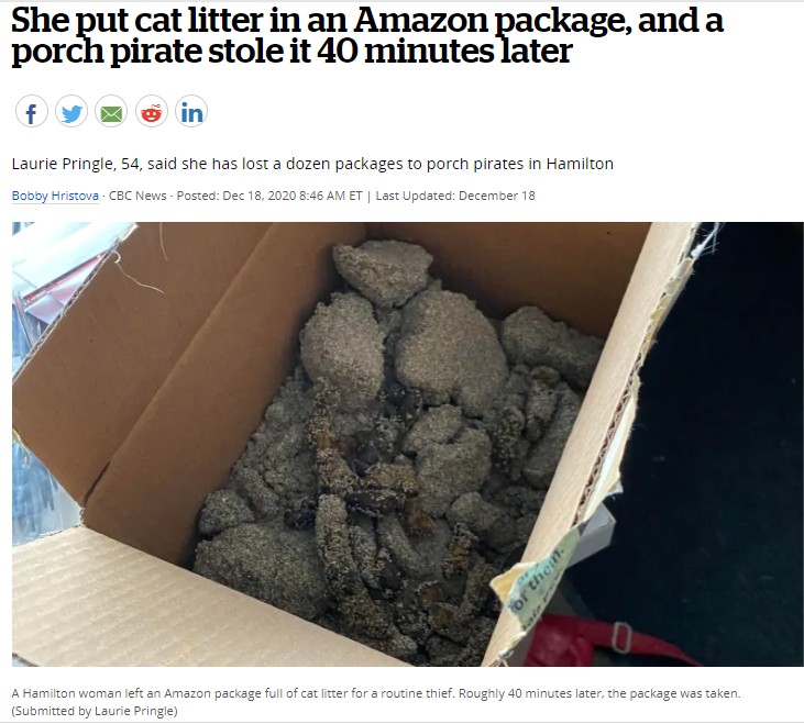門前包裹常被盜 加國大媽怒放貓屎