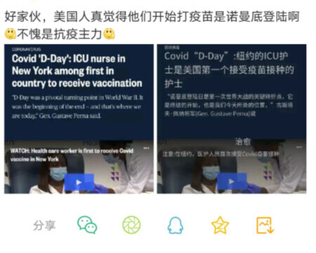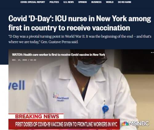 如下圖所示,美國NBC新聞網近日在壹則關於美國重症監護室的醫護人員將首批接種新冠疫苗的報道中,就引用美國政府疫苗項目壹位負責人的話稱,這是新冠疫情的“諾曼底時刻”。