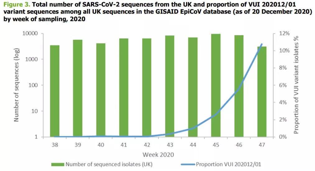 會議上展示的新冠病毒進化樹中,英國東南部確診增速較快的肯特郡有近半的確診病例是由該變異新毒株導致的。很快倫敦等地也開始呈現類似趨勢。11月,倫敦有約1/4的確診病例感染的是這種新毒株,而到了12月中旬,這壹數字已有約2/3。
