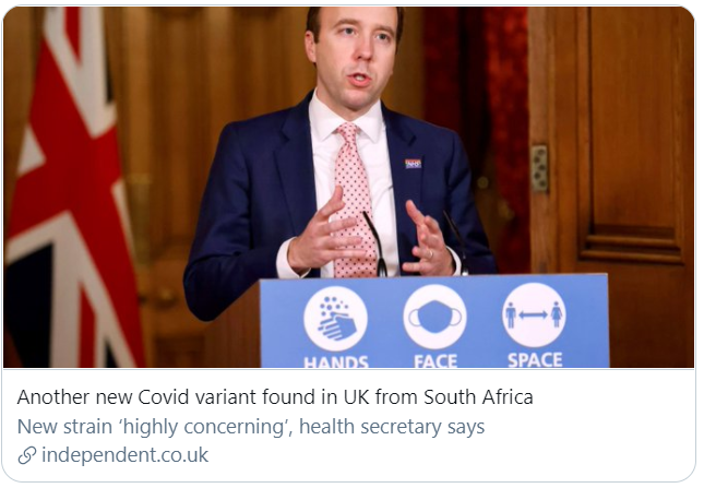 據《衛報》報道,當地時間12月23日,英國衛生大臣馬特·漢考克在新聞發布會上表示,繼此前發現“VUI-202012/01”新變種後,英國發現了第贰種新冠病毒的新變種。據調查,2名患者都曾與有南非旅行史的人接觸過。漢考克表示,南非發現的新冠病毒新變種已經到達英國。