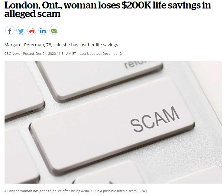 (加西網綜合)安省倫敦壹名72歲老婦投資比特幣,稱在聖誕節前幾天才意識到自己終生20萬元的積蓄被騙個精光!