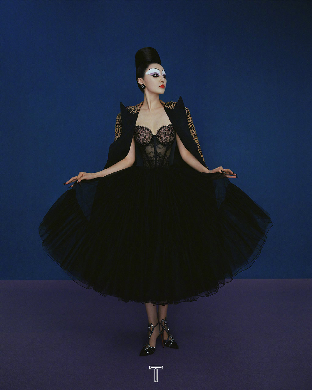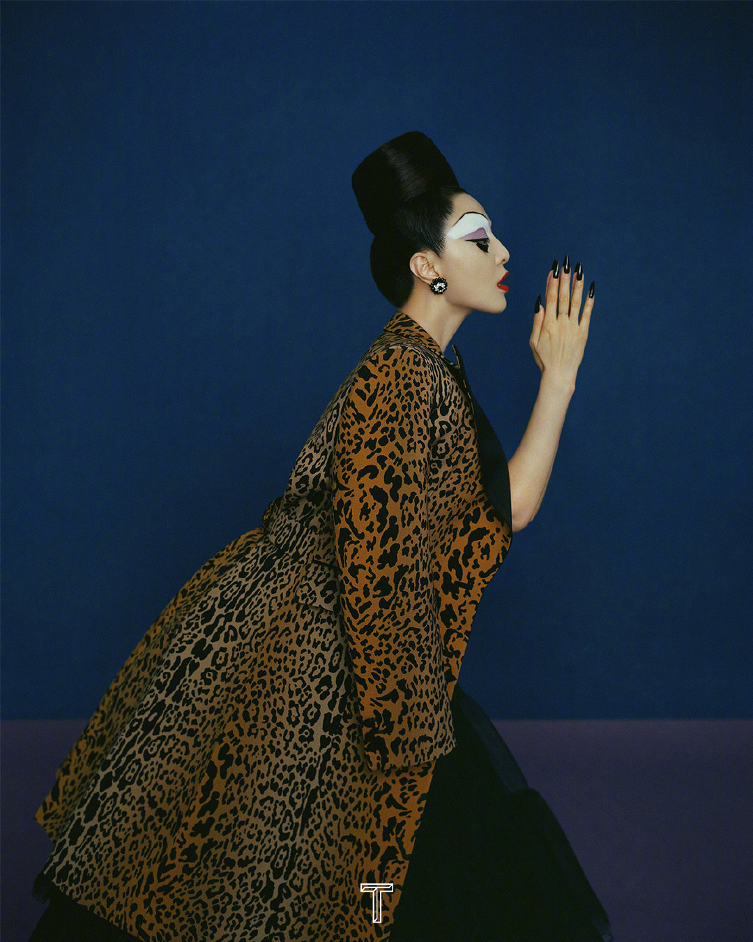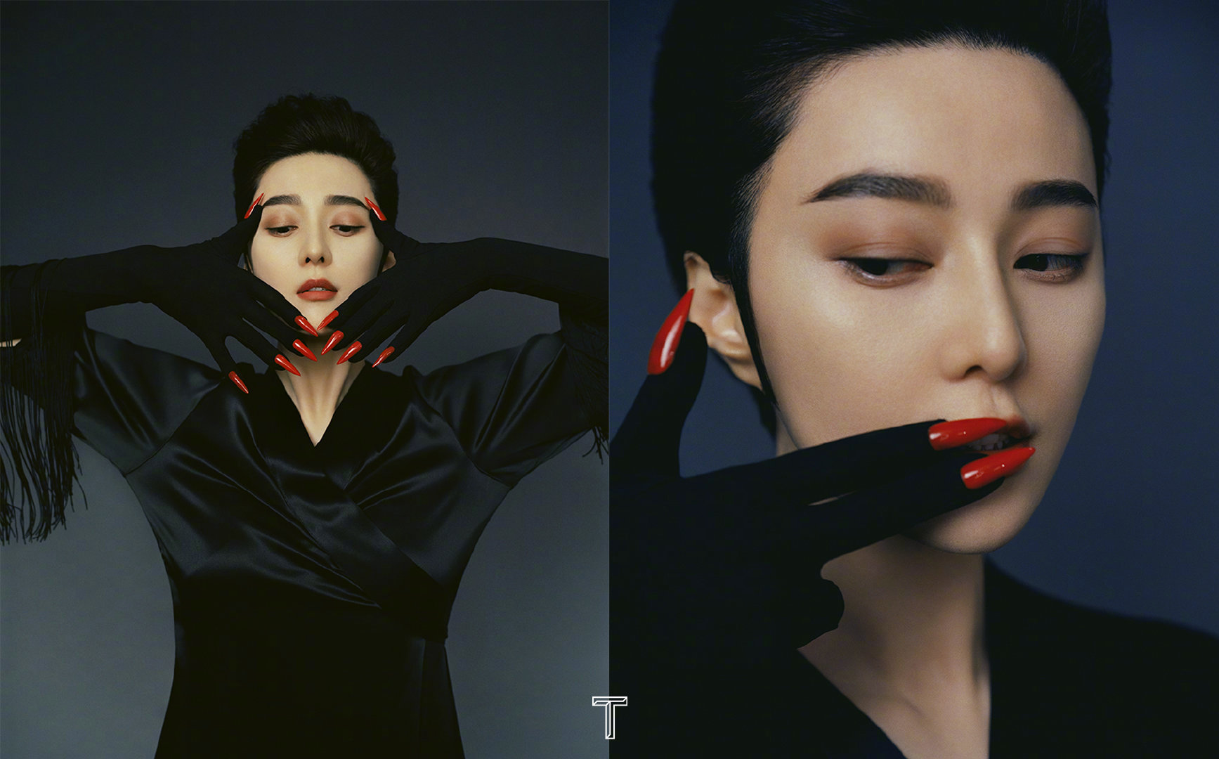 總是覺得造型師太喜歡拿范冰冰精致的顏值來嘗試這類怪誕的風格了,很難有好好美麗的感覺,這次的造型也是讓人有點可惜范冰冰的顏了。高高聳起的“女巫”發型有點暴露發際線問題,手套外的紅色美甲更是妥妥的惡魔范,整體看起來就很怪,粗重的眉毛看起來特別硬朗。