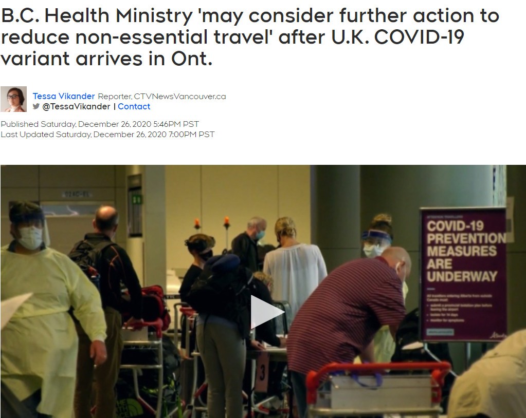 安省昨日宣布出現本國首宗英國變種新冠病毒相關病例,卑詩省衛生廳表示可能會考慮施加更多限制措施,以遏制不必要的旅行。