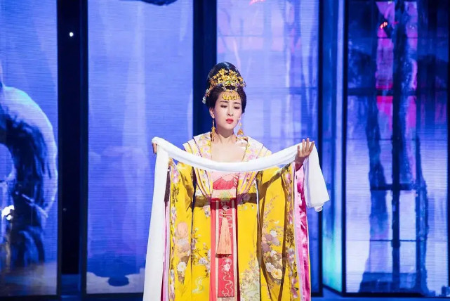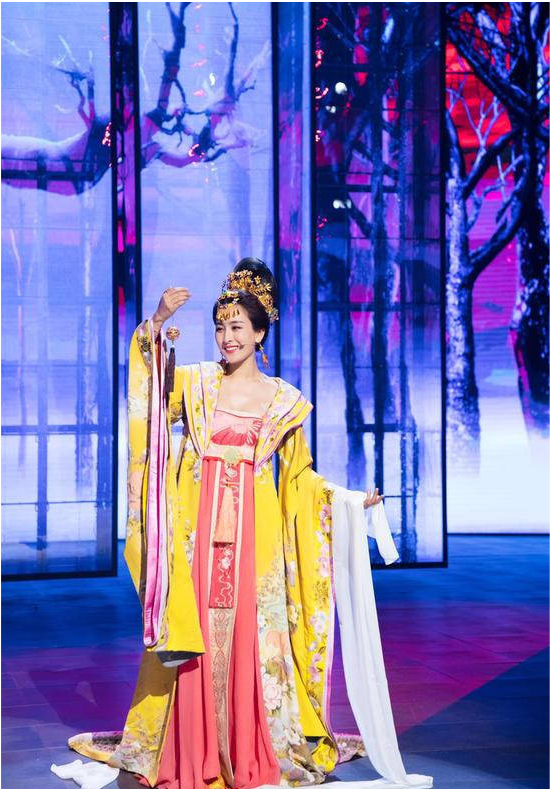這身色彩飽和度非常高的服飾,配楊貴妃,相得益彰。馬蘇也被襯托很有“貴妃”之感。