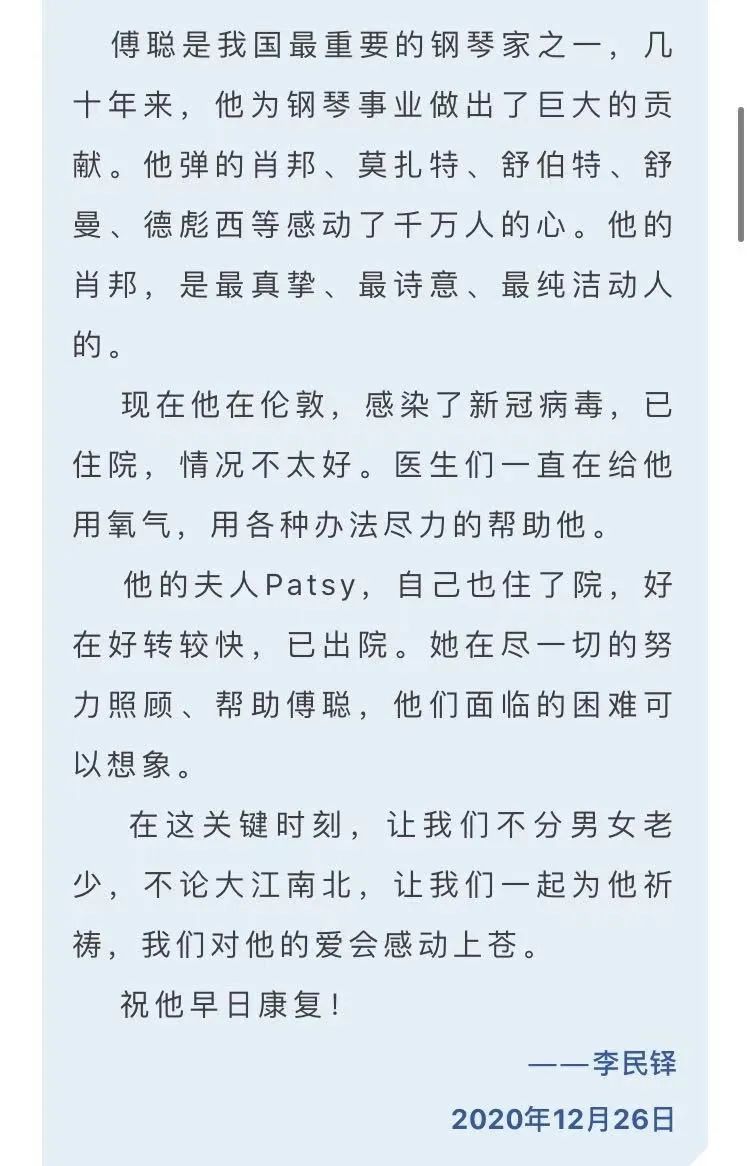 据英国皇家音乐学院中国籍教授、钢琴家孔嘉宁的朋友圈消息,钢琴家傅聪因感染新冠病毒,正在住院治疗。