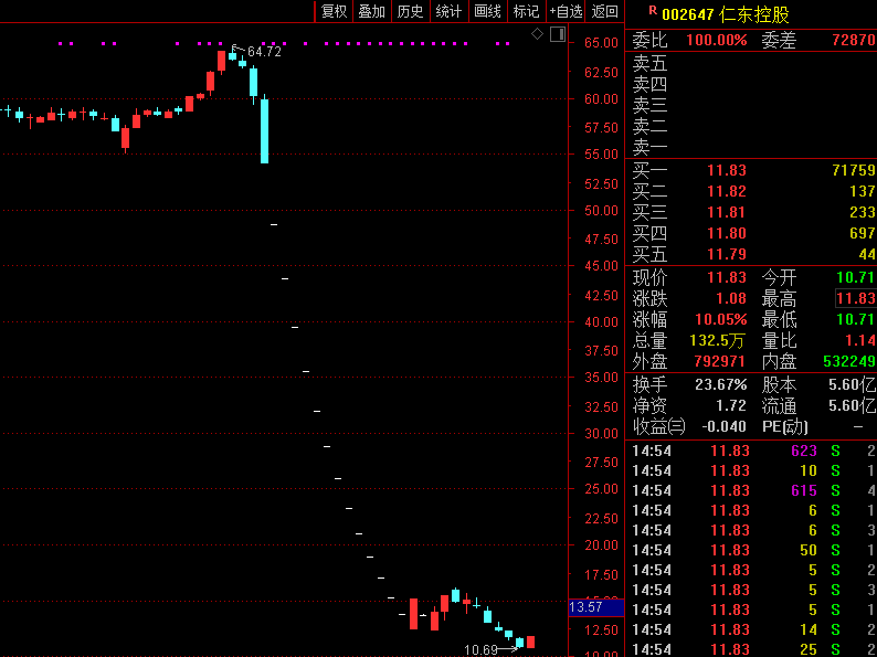 在國資背景的海金科集團托管之下,仁東控股的股價,從期初16元/股左右壹路上漲,最高價摸高至64.72元/股,漲幅超過3倍。而在今年11月18日海科金集團宣布離場後不久,“踩踏”的慘劇隨即上演。